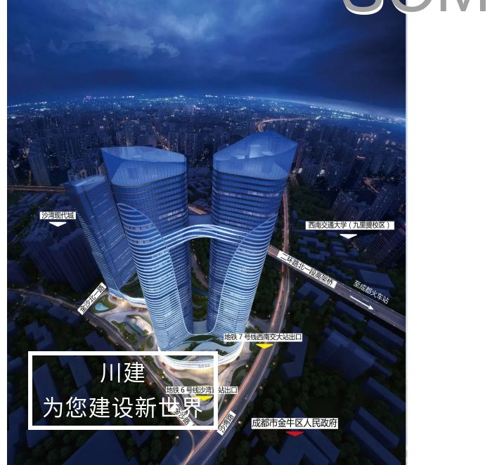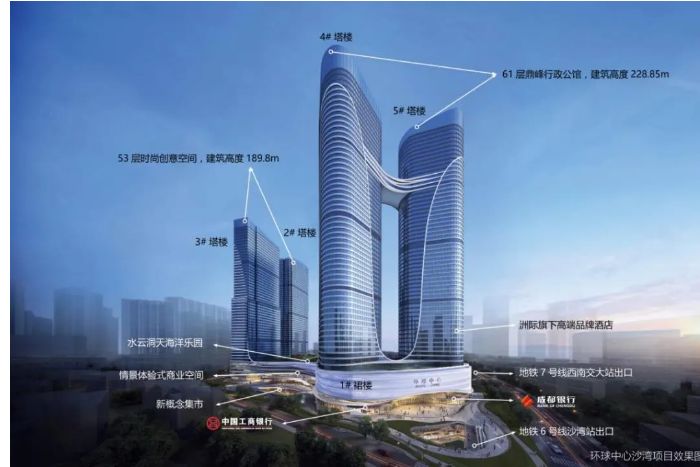 項(xiàng)目由3層商業(yè)裙樓(局部4層)及4棟超高層塔樓組成,最高塔樓高達(dá)243米,被譽(yù)為“摩天雙子塔,標(biāo)定時(shí)代天際線”、“新世紀(jì)·成都高端峰寓范本,當(dāng)代高階天幕藝術(shù)品,全球一線臻裝選材”,是成都市西北新地標(biāo)建筑。